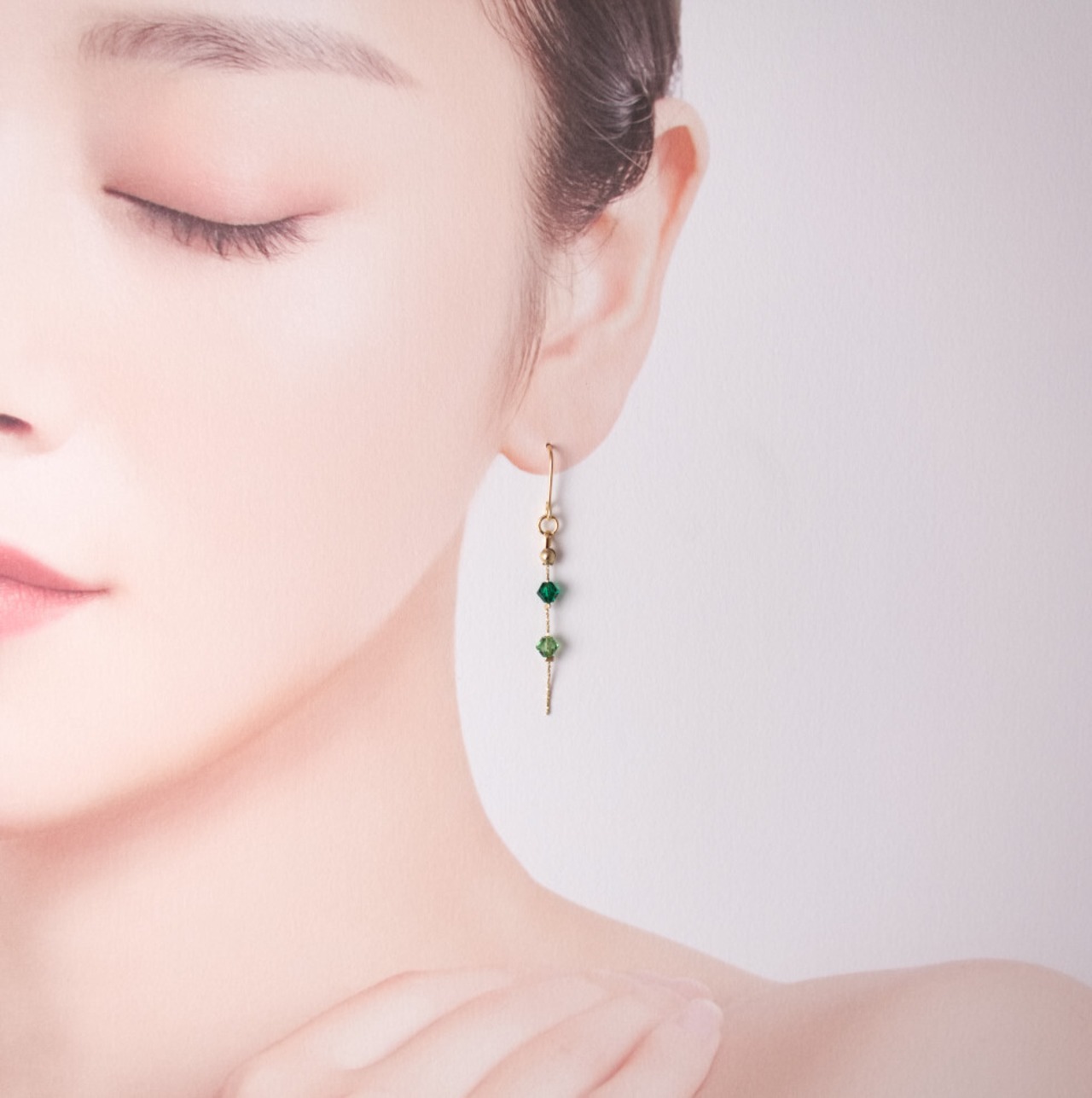 ゴールドチェーンの先にきらめく小さなガラスが、大人の可憐さを引き出します。
